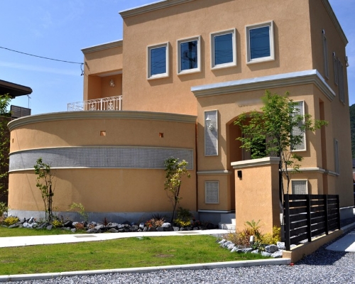 Ground Art Wall|グランドアートウォールは「特殊発泡素材」を採用しているため、カーブ形状をつけたり、好きな位置に小窓を付けるなど自由なデザインに仕上げることができます。また、仕上げ方法も「塗り壁」「タイル張り」「吹付け」など豊富にあり、建物とのコーディネートが可能となります。